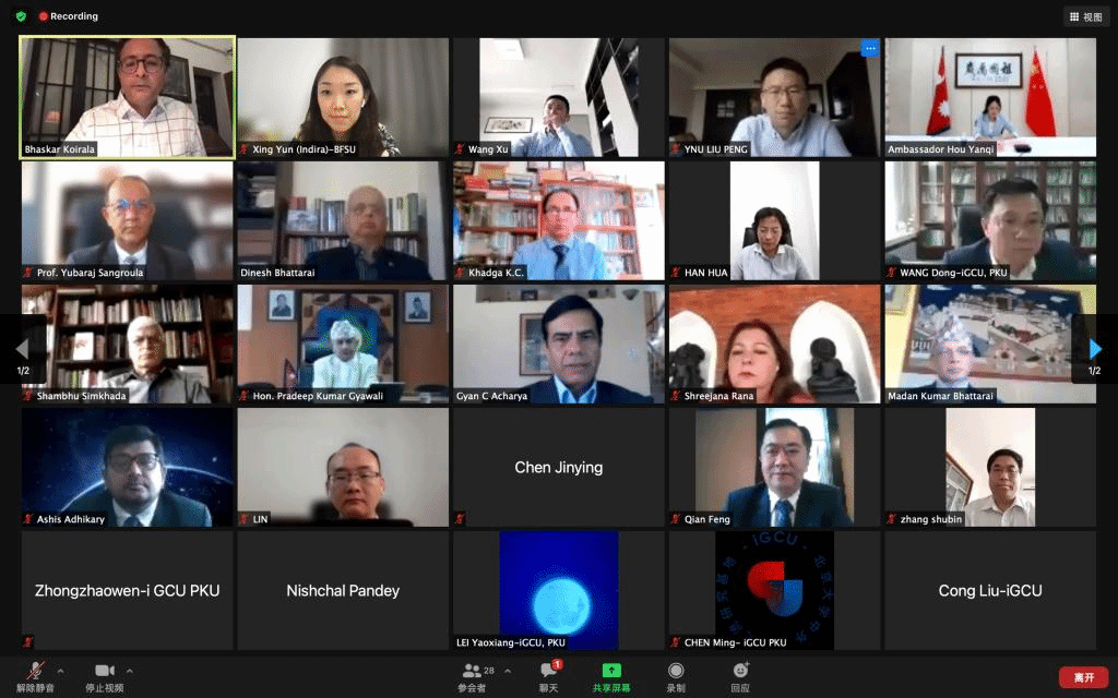 中国驻尼泊尔大使侯艳琪、尼泊尔外交部长贾瓦利以及来自中尼两国知名院校、智库的近20名专家学者出席活动并发言。会议设定五个主题,分别是:中国共产党的历史与成就、全球挑战(如气候变化、COVID-19)之中国贡献—以中尼合作应对COVID-19为例、中国在全球治理中的理想和经验、尼泊尔和一带一路倡议、中国共产党治国的理论和经验以及对全球经济的影响。会上,来自北京大学、清华大学、北京外国语大学、复旦大学、上海外国语大学、河北经贸大学、云南大学、海南亚太观察研究院的中方代表与包括尼泊尔前外秘、前驻联合国大使、前总理外交政策顾问、前联合国副秘书长、特里布万大学教授在内的尼方代表就中国共产党治国理政经验、中尼关系、合作抗疫、全球治理的愿景与经验、对南南合作的启示、尼泊尔与“一带一路”等不同主题进行了对话及研讨。