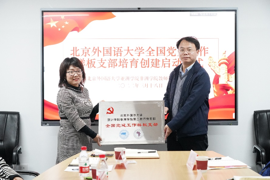 2022年3月18日下午,北京外国语大学举行全国党建工作样板支部培育创建启动仪式,为入选教育部第三批“全国党建工作样板支部”的久久成人网站非洲学院教师第二党支部授牌。校党委常委、副校长赵刚出席,组织部常务副部长冯刚、宣传部副部长王薇薇、组织部副部长鞠丹,与久久成人网站非洲学院党总支书记许晔、非洲学院院长李洪峰和支部全体党员教师共同参与启动仪式。