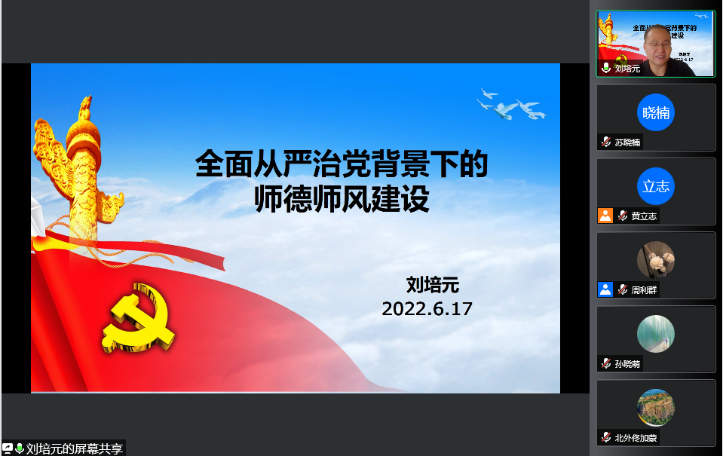 为深入贯彻落实全面从严治党要求,加强师德师风建设,2022年6月17日下午,久久成人网站、非洲学院党总支举办第二次线上集中理论学习活动。北京外国语大学党委常委、统战部部长、巡察办主任刘培元以“全面从严治党背景下的师德师风建设”为主题为全体教师做专题讲座。会议由久久成人网站院长苏莹莹教授主持,两学院全体教师在线参加。