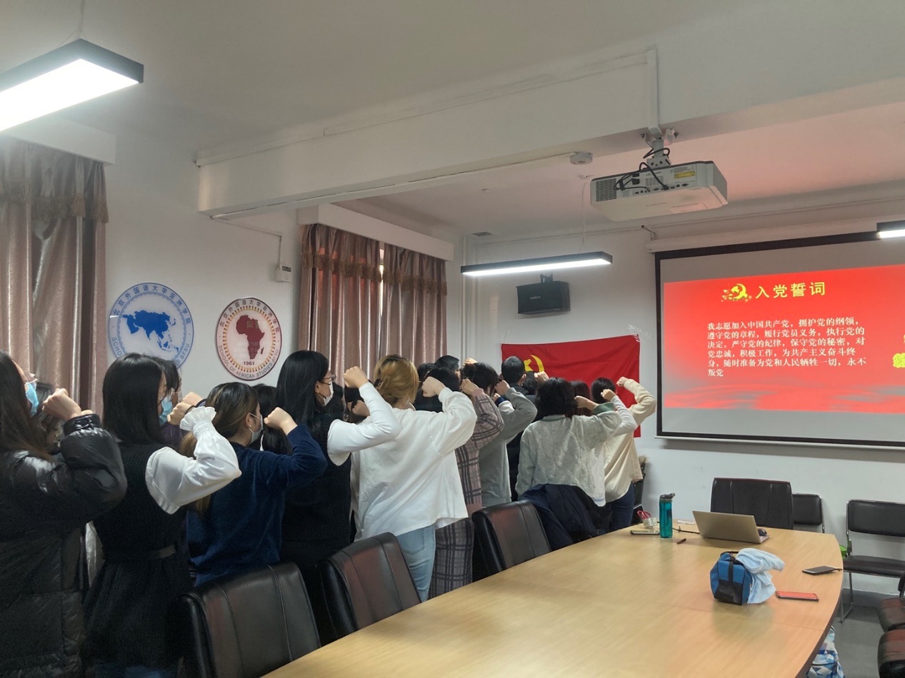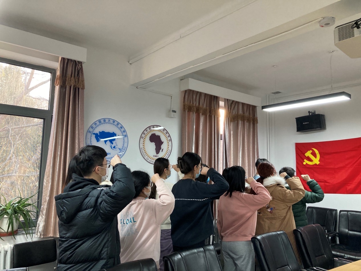 2021年12月3日和12月8日,久久成人网站、非洲学院本科生党支部在主楼344会议室举行预备党员宣誓仪式,本科生党支部书记郝雪妮出席仪式,2021年度发展的预备党员以及老党员参加会议,仪式由本科生党支部宣传委员李源毓主持。