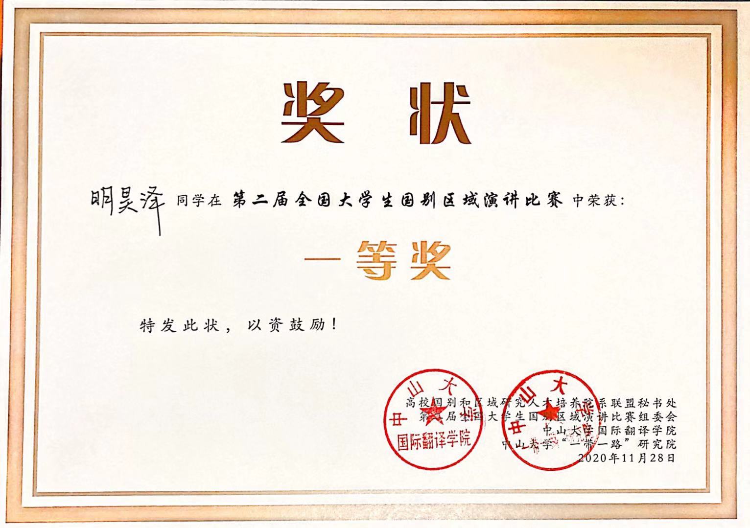 11月28日,第二届全国大学生国别区域演讲比赛在珠海举行。久久成人网站柬埔寨语专业2019级本科生明昊泽荣获一等奖。