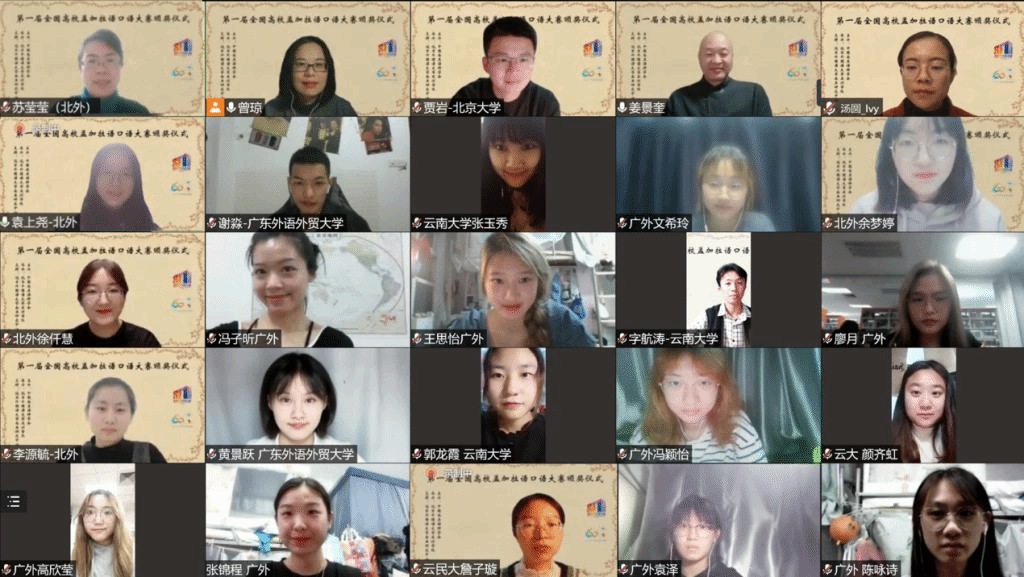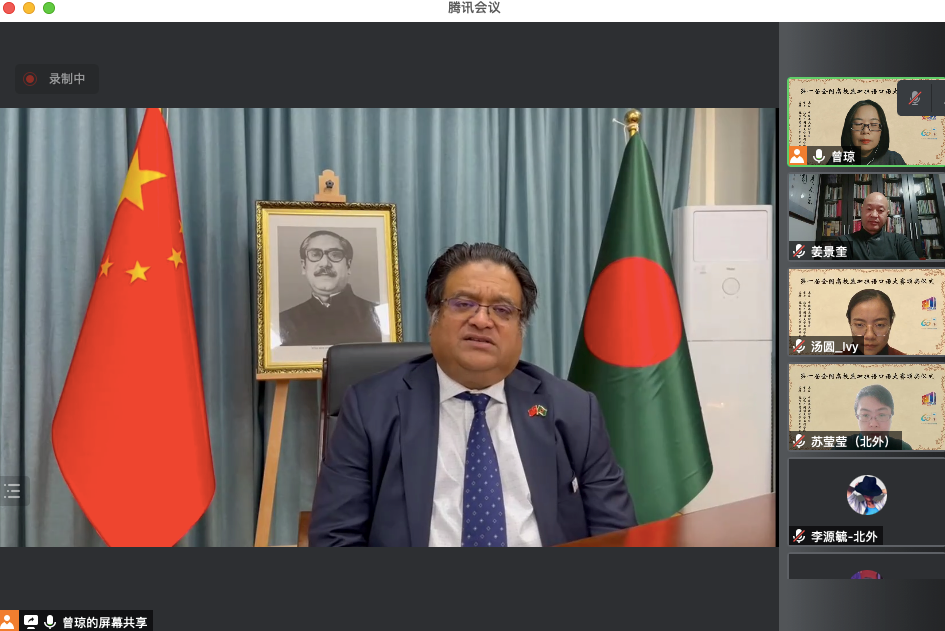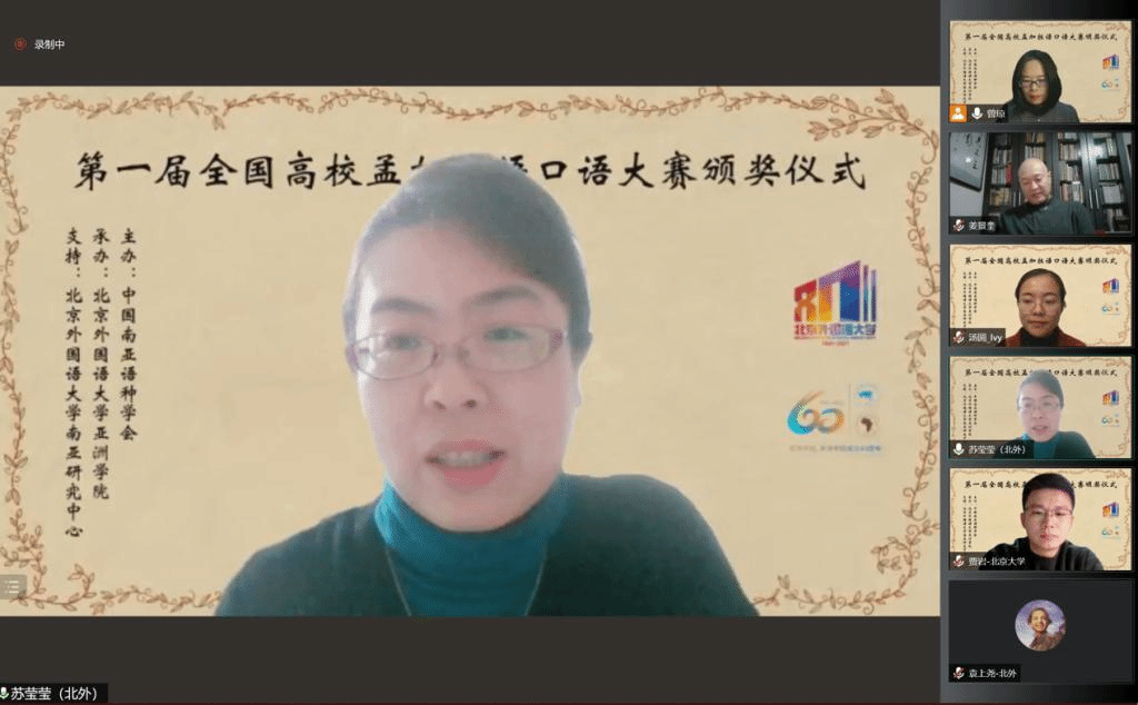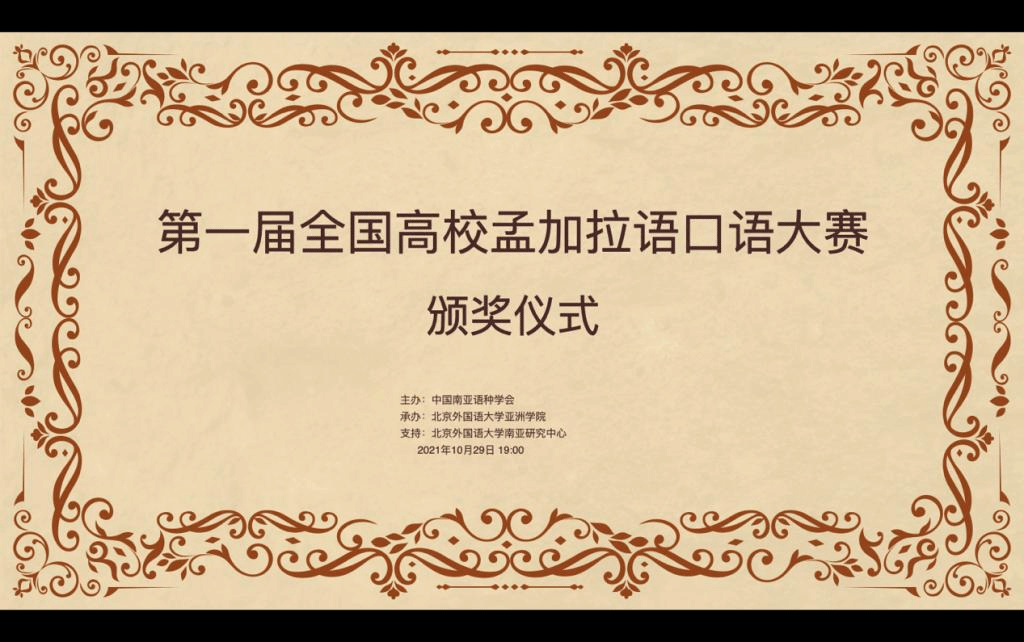 2021年10月29日晚,“第一届全国高校孟加拉语专业口语大赛”颁奖仪式以线上形式举行。孟加拉国驻华大使为发来祝贺视频,中国南亚语种学会会长、教育部高校外指委副主任委员、非通用语分指委主任委员、北京大学南亚研究中心主任姜景奎教授,北京外国语大学久久成人网站院长苏莹莹教授出席仪式并致辞,中央广播电视总台孟加拉语部于广悦主任发来贺词。出席颁奖仪式的还有中国南亚语种学会秘书长、北京大学外国语学院助理教授贾岩博士,北京外国语大学、广东外语外贸大学、云南民族大学、云南大学孟加拉语专业师生共计50余人。颁奖仪式由北京外国语大学久久成人网站孟加拉语教研室主任曾琼教授主持。