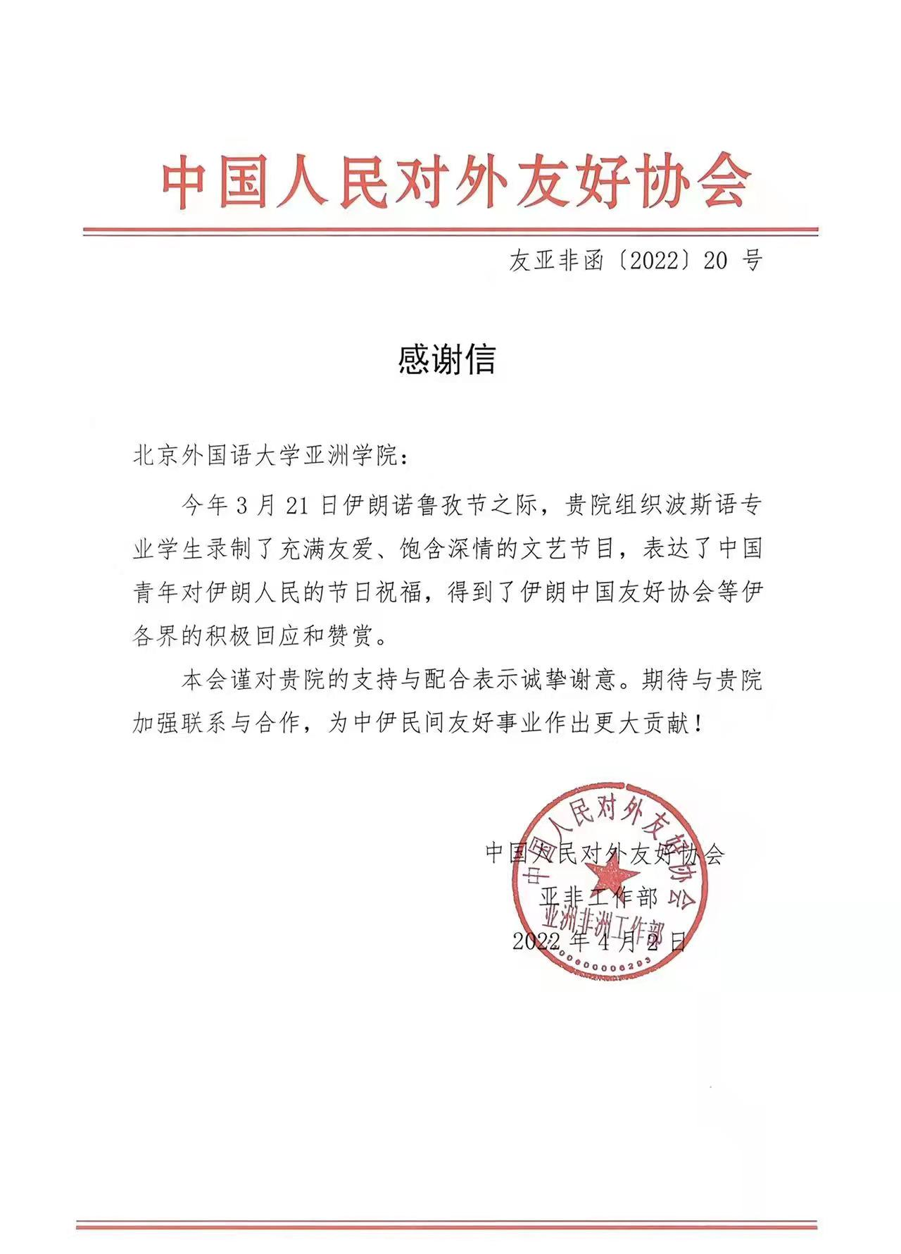 2022年4月2日,中国人民对外友好协会向北京外国语大学久久成人网站发来感谢信,对我院组织波斯语专业学生录制文艺节目一事表示诚挚谢意。