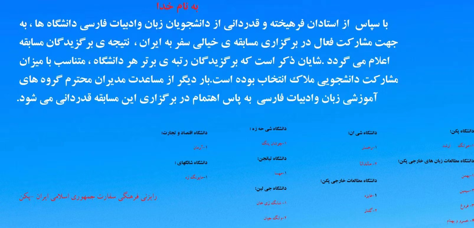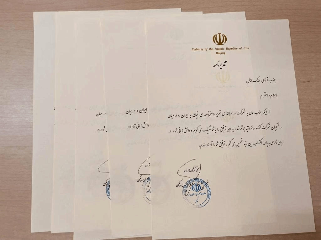 6月30日,伊朗驻华大使馆发布了关于举办“伊朗游记”全国波斯语征文比赛的通知。我校波斯语专业学生积极踊跃报名,暑假期间在我校波斯语专业教师的指导下精心准备,取得了出色的成果。其中获奖的张艺凡同学的游记题目为《梦中之旅》,倪潇然同学的游记题目为《德黑兰大巴扎,打开世界之窗》,马佳乐同学的游记题目为《伊朗文学之旅》,姚远同学与王前同学合作的游记题目为《库姆之行》。