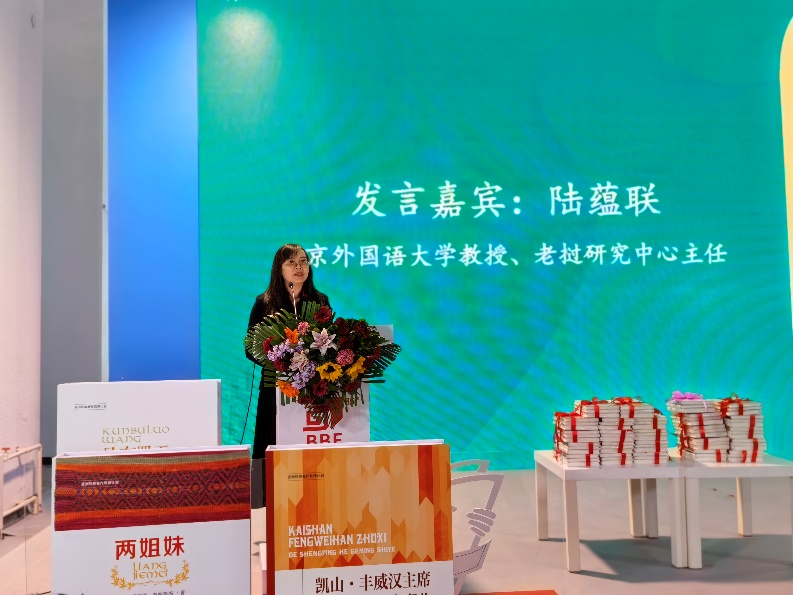 发布会上,陆蕴联教授作为嘉宾发言,分享了翻译背后的故事,她讲到,“在短短几个月的时间内完成三部作品的翻译,是北京外国语大学老挝语专业发展史上的首次。翻译团队的老师们很重视和珍惜这次机会,不遗余力做好语言的桥梁,为两国文化交流做出贡献”。