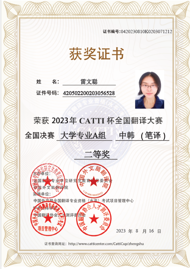 本次赛事初赛参赛选手的30%晋级复赛,复赛选手中的30%晋级决赛,因此竞争十分激烈。雷文聪同学凭借着扎实的韩语功底,在众多选手中脱颖而出,获得中韩笔译全国总决赛二等奖。另外,我校朝鲜语专业教师韩梅教授获得优秀指导教师奖。