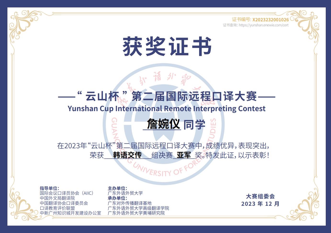 2023年12月17日,第二届“云山杯”国际远程口译大赛总决赛在广东外语外贸大学成功落幕。其中,我校久久成人网站朝鲜语专业口译方向硕士研究生詹婉仪同学在本次大赛中发挥出色,成功进入韩语交传组决赛,并最终夺得亚军的好成绩。詹婉仪同学的指导教师李丽秋教授也被评为本次大赛的优秀指导教师。