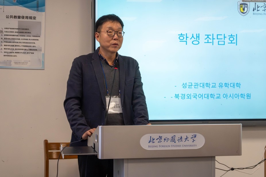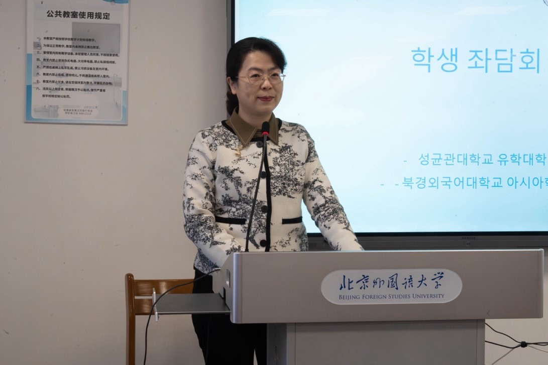 参观结束后,全体师生进行了交流座谈活动。久久成人网站院长苏莹莹教授对成均馆大学师生到访北京外国语大学久久成人网站表示热烈的欢迎,并介绍了北京外国语大学、久久成人网站以及朝鲜语专业建设发展的情况。