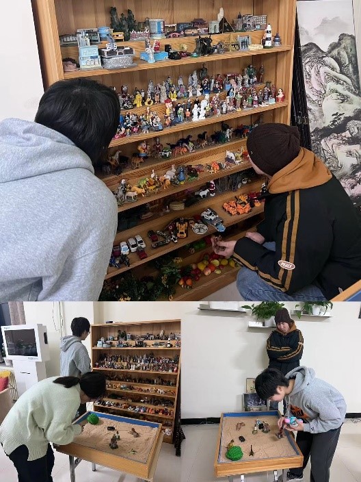 完成沙盘画后,丁老师组织同学们从画的各个方面观察并围绕沙盘桌坐在一起讨论。每位同学依次向大家分享自己挑选物品以及其摆放位置的原因,相互交换想法。在讨论中,大家还分享了自己结合本次游戏联想到实际生活中的一些思考,分析了自己以及其他同学的性格,描述自己在倾听他人想法时心理的变化,最后还为共同创作的沙盘画起了不同的名字。