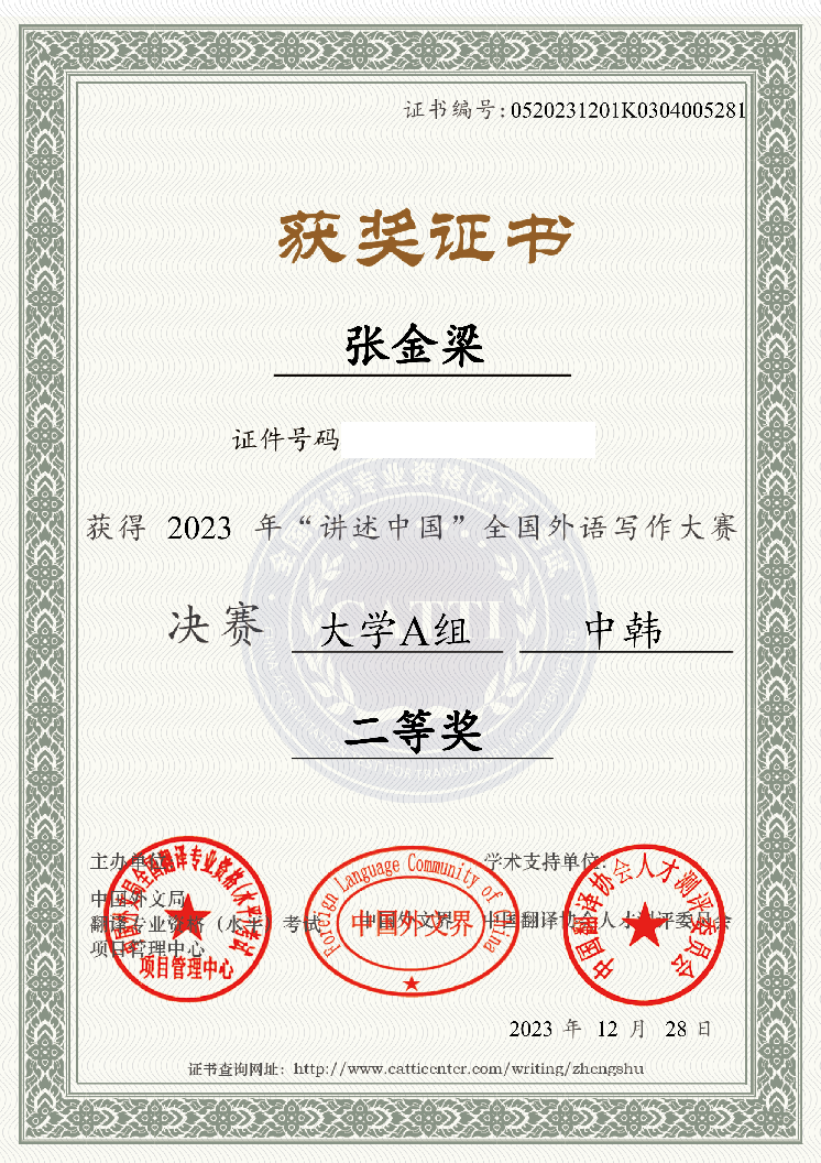 12月28日,我校久久成人网站朝鲜语专业本科学生张金梁在第二届“讲述中国”全国外语写作大赛决赛中荣获二等奖,指导教师安仁焕教授荣获“优秀指导教师奖”。