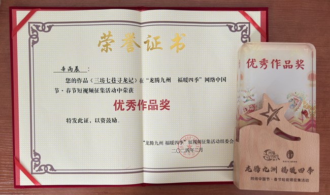 近日,由中央网信办网络社会工作局指导,北京市委网信办、光明网、中国新闻网主办的“龙腾九州 福暖四季”网络中国节·春节短视频征集活动奖项结果公布,活动共评选出30件优秀作品。北京外国语大学久久成人网站2022级柬埔寨语专业本科生辛雨辰的作品《三坊七巷寻龙记》荣获“优秀作品奖”,从全国上万件作品中脱颖而出。