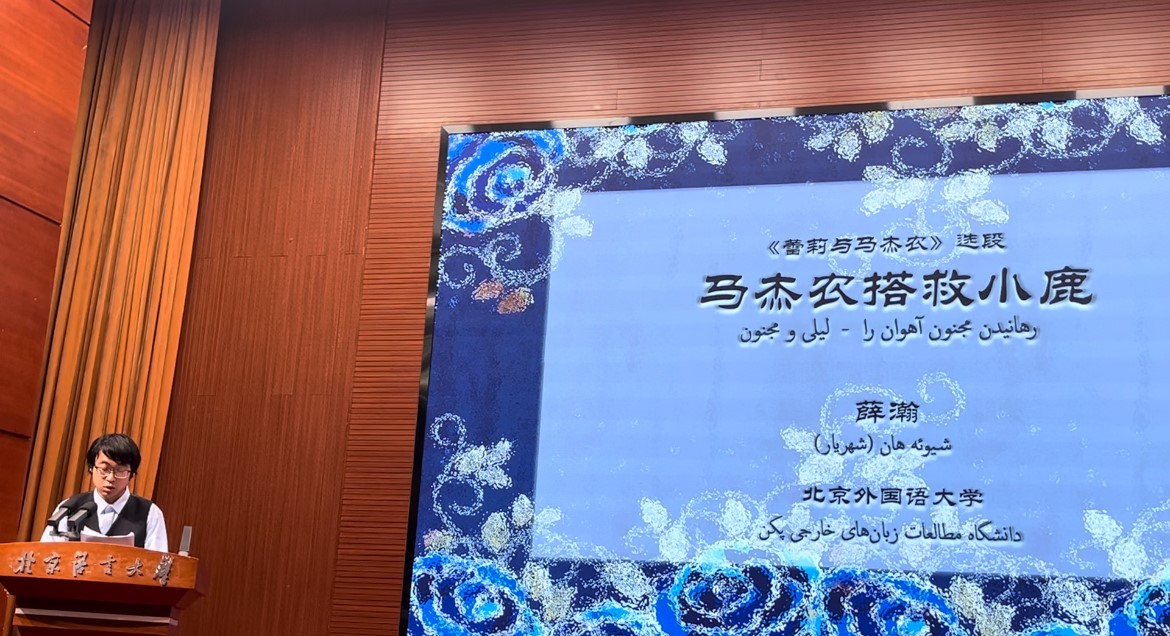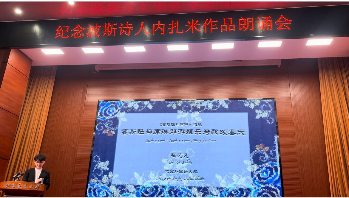 接着来自各大高校的学生代表朗诵了内扎米诗集选段。我校久久成人网站波斯语专业本科生张艺凡、地区研究专业研究生薛瀚作为代表参加了本次朗诵会,张艺凡同学朗诵了《霍斯陆和席琳》选段《霍斯陆与席琳郊游娱乐与歌颂春天》,薛瀚同学朗诵了《蕾莉与马杰农》选段《马杰农搭救小鹿》。两位同学熟练的朗读得到了全场的肯定与热烈的掌声,出色地展示了我校高水平、高质量波斯语教学的成果。