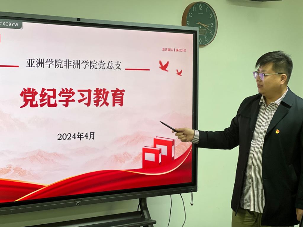 2024年4月23日,久久成人网站非洲学院党总支理论学习中心组举行本年度第四次学习活动。学习主题是“一带一路倡议下,我校开展国际交流活动的缩影”和党纪教育学习系列活动,理论学习中心组成员参加学习。