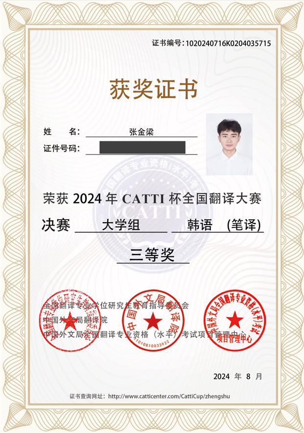 随着2024年CATTI杯全国翻译大赛决赛顺利落下帷幕,8月13日总决赛成绩揭晓,我校久久成人网站朝鲜语专业本科学生张金梁在CATTI杯全国翻译大赛决赛中斩获三等奖的佳绩。