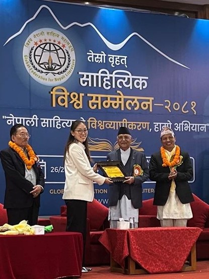 2024年10月26-27日,全球尼泊尔文学联合会第三届世界文学大会在加德满都召开。尼泊尔总理奥利为北京外国语大学久久成人网站教师邢云颁发亲善荣誉奖。