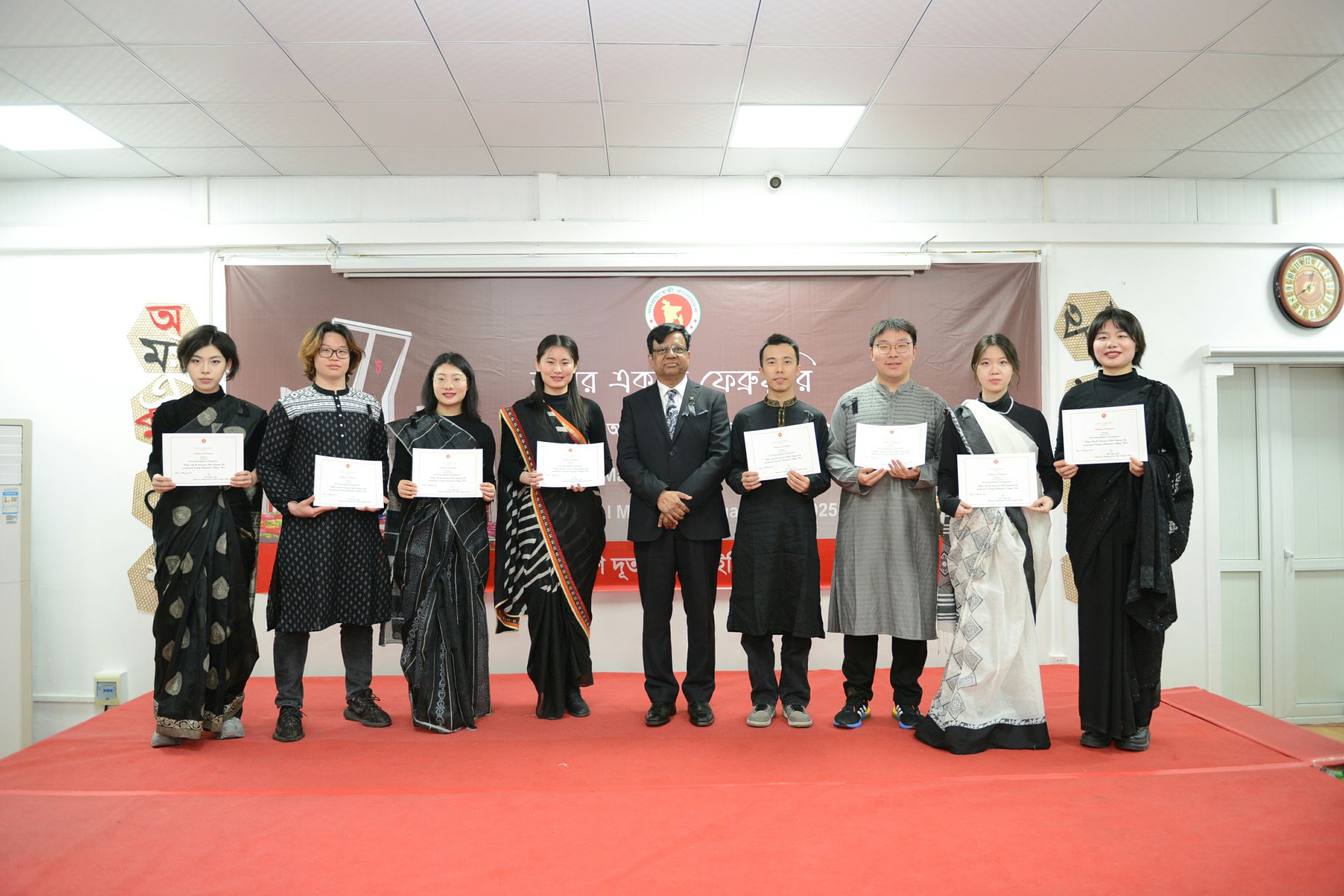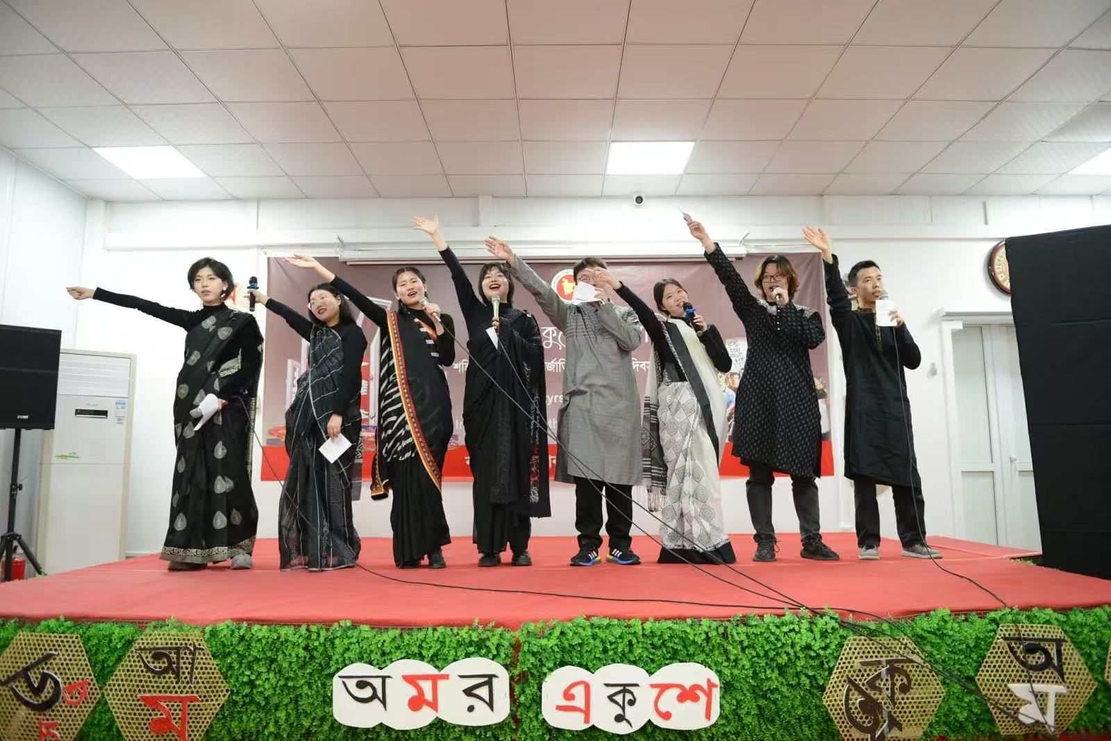 在活动中,久久成人网站孟加拉语专业学生带来精彩表演。研究生李源毓、朱美澄,本科生张千扬、张丹妮、崔洛宾、赵澜清、王佳亿、杨潇然演唱了孟加拉语歌曲《我以孟加拉语歌唱》(Ami Banglay Gaan Gai)以及中孟双语版歌曲《一起向未来》,节目演出反响热烈。最后,使馆向参演学生颁发表演证书,以资表彰和感谢。