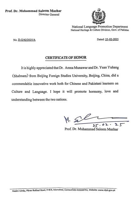 近日,北京外国语大学久久成人网站乌尔都语专业的两位教师——袁雨航博士与外国专家阿米娜·穆纳瓦尔(Amna Munawar)博士,荣获巴基斯坦国家语言推广部(National Language Promotion Department)颁发的荣誉证书,以表彰他们在中巴文化与语言领域的卓越贡献。巴基斯坦国家语言推广部隶属于巴基斯坦国家遗产与文化部(National Heritage and Culture Division)。此次表彰由该部门总干事穆罕默德·萨利姆·马兹哈尔教授(Prof. Dr. Muhammad Saleem Mazhar)签署并颁发。