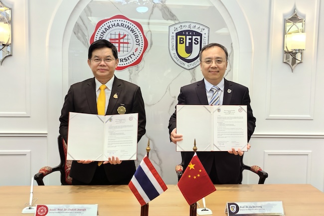 4月25日,代表团访问泰国诗纳卡琳威洛大学。诗纳卡琳威洛大学校长春拉威·吉拉杰会见代表团一行。春拉威·吉拉杰介绍了诗纳卡琳威洛大学的办学成就,尤其是在教育学、经管类学科建设和研究方面取得的成果。贾德忠介绍了北外在中泰教育交流中发挥的作用,期待在联合开展东南亚研究、教育学科研究交流方面进行更多合作。双方签署《北京外国语大学与诗纳卡琳威洛大学合作备忘录》。